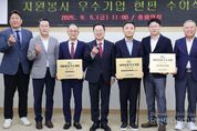 시민행정신문 강갑수 기자 | 대전시는 5일 시청 중회의실에서 자원봉사활동이 우수한 기업 3곳에 ‘2025년도 자원봉사 우수기업’ 현판을 수여했다. 수여식에는 이장우 대전시장과 김현호 대전시자원봉사센터장, 김영태 대전시자원봉사연합회장을 비롯해 길상원 ㈜건일엔지니어링 대표, 박균익 ㈜아이씨푸드 대표, 장필규 현대프리미엄아울렛 상무와 박재성 대전점장 등이 참석했다. 이번에 현판을 받은 세 기업은 2023년 12월 대전시와 ‘자원봉사 사회공헌 협약’을 체결한 뒤 적극적인 사회공헌 활동을 펼쳐 지난해 12월 ‘자원봉사 우수기업’으로 선정됐다. ㈜건일엔지니어링은 ▲취약계층을 위한 명절 및 김장나눔 행사 후원(매년) ▲지역 내 아동시설에 사랑의 운동화 물품 후원 ▲2025년 영남지역 산불 재난 간식 후원 등 꾸준한 나눔을 실천해 왔다. ㈜아이씨푸드는 ▲추석 명절맞이 온정나눔 후원 ▲제80회 식목일 기념 나무심기 행사 참여 ▲기업과 전통시장이 함께하심 사업 후원(매년) ▲대전시 체육 우수선수 장학금 지급(매년) ▲대전꿈돌이라면 매출액 1% 기부 등 다양한 활동을 이어왔다. 현대프리미엄아울렛 대전점은