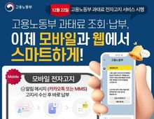 시민행정신문 장규호 기자 | 고용노동부 과태료 조회·납부, 이제 모바일과 웹에서 스마트하게! ■ 모바일 전자고지 알림 메시지(카카오톡 또는 MMS) 고지서 수신 후 바로 납부 1. 수신동의 및 본인인증 2. 고지서 조회 3. 계좌이체·카드 납부 ※ 모바일 전자고지 미열람자 및 수신거부 시 우편으로 종이고지서 발송 ■ 고용노동부 홈페이지 과태료 조회·납부 -대표홈페이지 → 민원 → 과태료 조회·납부 1. 본인인증 2. 고지서 조회 및 출력 3. 계좌이체·카드 납부 4. 납부 이력 조회 ☞ 문의사항: 관할 지방고용노동관서 고용관리과(지역협력과)
