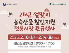 시민행정신문 장규호 기자 | ■ 2026년 설맞이 농축산물 할인지원 전통시장 환급행사 - 2026.2.10.(화)~2.14.(토) (5일간) - 환급소 운영시간 9:00~17:00 ※ 운영시간은 시장상황에 따라 변경될 수 있음 · 행사기간 내, 1인 2만 원 한도 행사기간 내 구매 영수증 금액 합산 가능/ 추가, 중복 수령 불가 - 3만 4000원 이상 구매 시 온누리 상품권 1만 원 환급 - 6만 7000원 이상 구매 시 온누리 상품권 2만 원 환급 예산 소진 또는 부정환급 적발 시 조기종료 ■ 환급절차 ① 국내산 신선 농축산물 구매 후 영수증 수령 ② 점포주가 농축산물 환급 앱에 판매 정보 입력 ③ 구매 영수증, 본인확인 수단(휴대전화) 지참 후, 환급소 방문 ④ 구매한 영수증 및 본인확인 후 상품권 수령 ■ 행사대상 참여 점포에서 국산 신선 농축산물 구매한 고객 ■ 불가항목 · 본인확인 수단(휴대전화) 미지참 시 환급불가 · 국산 신선 농축산물이 아닌 품목 · 행사 미등록 점포 구매 영수증 · 재발행 영수증, 간이 영수증 환급 · 행사 기간 내 구매가 아닌 영수증 · 구매 고객이 아닌 대리인(