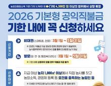 시민행정신문 장규호 기자 | 2026 기본형 공익직불금 기한 내에 꼭 신청하세요. 농업외종합소득 기준 ('25) 3700만 원 → ('26) 4300만 원 이상의 범위에서 상향 예정 ■ 신청기간 · 비대면(스마트폰, 전화): 3월 1일 ~ 5월 31일 ※ 전년도 직불금 지급 정보와 현재 경영체 정보가 동일하며, 농식품부로부터 문자(1334) 등을 통해 안내받은 농가 대상 · 방문(읍·면·동 행정복지센터): 3월 1일 ~ 5월 31일 ※ 기한 내에 신청하지 않을 경우 직불금 지급 불가 ■ 신청대상 지급 대상 농지 1000m² 이상에서 직접 농사를 짓고 농외소득, 경영체 등록 등 요건을 충족하는 농업인 등 ※ 자세한 자격요건은 농지소재지가 있는 읍·면·동에 문의 ■ 문의 읍·면·동 행정복지센터 및 국번없이 ☎1334
