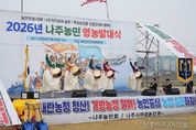 시민행정신문 강갑수 기자 | 전남 나주시가 본격적인 영농철을 앞두고 농업인의 화합과 결속을 다지며 풍년 농사를 기원하는 영농발대식을 개최했다. 나주시는 지난 25일 영산강둔치체육공원에서 ‘2026년 농업인 영농발대식’을 열고 한 해 농사의 시작을 알렸다고 26일 밝혔다. 이번 행사는 나주농민회(회장 박용래)와 나주시여성농민회(회장 송숙희)가 공동 주관했으며 지역 농업인과 시민 등 1500여 명이 참석해 새로운 농사의 출발을 함께했다. 영농발대식은 매년 영농철을 앞두고 농업인의 무사 안녕과 풍년을 기원하고 영농 의지를 다지는 나주시 대표 농업 행사로 자리잡고 있다. 특히 기후변화와 농자재 가격 상승, 농촌 고령화와 인력 부족 등 어려운 여건 속에서 농업인의 사기를 높이고 지속 가능한 농업 발전 의지를 다지는 의미를 더했다. 이날 행사는 풍물패 길놀이 공연을 시작으로 나주시립국악단 축하공연과 고천제가 이어지며 한 해 풍년과 농업인의 안녕을 기원했다. 기념식에서는 농민회장과 여성농민회장의 대회사와 함께 전농 광주전남연맹 의장의 격려사, 농업 발전과 농민 권익 향상을 위한 결의문이