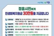 시민행정신문 강갑수 기자 | 정읍시가 고물가와 경기 침체로 신음하는 시민들의 가계 부담을 덜어주기 위해 오는 19일부터 모든 시민에게 1인당 30만원의 민생회복지원금을 지급한다. 이번 지원금 지급은 2024년 말에 이어 두 번째로 시행되는 조치로, 시는 지난해에도 강도 높은 재정 혁신과 예산 절감 노력을 기울여 재원을 확보했다. 이를 시민들에게 환원해 지역 내 소비를 촉진하고 민생 경제에 활력을 불어넣겠다는 계획이다. 지급 대상은 2025년 12월 15일 이전부터 신청일 현재까지 정읍시에 주민등록을 두고 거주 중인 모든 시민이다. 여기에는 결혼이민자와 영주권자도 포함된다. 다만, 기준일 이후 사망했거나 타 지역으로 전출한 자, 주민등록이 말소된 경우에는 지급 대상에서 제외된다. 신청 기간은 오는 19일부터 2월 13일까지 4주간 진행된다. 지원금을 받으려는 시민은 2025년 12월 15일 기준 주소지 관할 읍·면·동 행정복지센터를 방문해 신청하면 된다. 본인 신청 시 신분증과 신청서를 지참해야 하며, 대리인이 방문할 경우 위임 동의서와 위임자 및 대