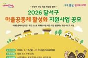 시민행정신문 강갑수 기자 | 대구 달서구는 주민이 스스로 마을에 필요한 사업을 발굴하고 실행하는 ‘2026년 마을공동체 활성화 지원사업’ 참여자를 2월 13일까지 모집한다. 올해로 7년째를 맞는 달서구 마을공동체 활성화 지원사업은 2020년부터 현재까지 총 79건의 사업을 지원해 왔으며, 탄소중립 실천, 공동텃밭, 공동육아, 소외계층 돌봄, 마을축제 등 다양한 분야에서 주민 주도의 마을문제 해결과 공동체 기반 확충에 기여하고 있다. 이번 공모는 총 3개 분야로 15개팀 내외를 선정해 공동체 역량과 사업 성격에 따라 단계별로 사업비를 지원한다. 지원 규모는 ▲ 신규 공동체를 위한 ‘신참마을’ 200만원 이내 ▲ 경험 있는 공동체를 위한 ‘도약마을’ 300만원 이내 ▲ 마을축제 등을 위한 ‘주민화합행사’ 500만원 이내이다. 신청 자격은 5인 이상 달서구 주민 모임 또는 단체이며, ‘주민화합행사’는 10인 이상이 참여해야 한다. 또한 교육·환경·복지·안전·문화 등 마을에 필요한 다양한 분야에서 다수 주민이 공감하고 함께 참여할 수 있는 공익성 사업이어야 한다. 신청 서식과 자