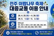 시민행정신문 강갑수 기자 | 주말을 맞아 이팝나무가 만개한 전주시 팔복동 철길을 찾는 시민들을 위해 전주시내버스가 더 자주 다닌다. 전주시는 오는 25일~26일, 5월 1일~3일 등 총 5일간 팔복예술공장 일대에서 펼쳐지는 ‘2026 전주 이팝나무 축제’에 맞춰 방문객 집중 시기에 시내버스 운행을 조정하는 등 교통수요 중심의 운영 대책을 추진한다고 23일 밝혔다. 시는 올해 4월 벚꽃 개화 시기에 맞춰 만경강변 일대에 특별노선을 운영하는 등 계절별 관광수요에 대응한 교통 지원을 추진했으며, 이러한 운영 경험을 바탕으로 이번 이팝나무 축제 기간에도 교통 운영을 이어갈 계획이다. 이번 축제는 개화 시기에 맞춰 연속 운영이 아닌 주말·공휴일에 집중 운영 방식으로 진행되는 것이 특징으로, 시는 방문객이 몰리는 시기 주말·공휴일 버스 운행을 조정해 5개 노선에 버스 7대를 추가 하는 등 교통 지원을 강화키로 했다. 축제장을 경유하는 전주시내버스 노선은 △101번 △103-1번 △103-2번 △337번 △383번 △385번 △401번 △402번 △403번 △420번 △644번 △684번 △1001번 △100