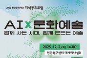 시민행정신문 강갑수 기자 | 천안문화재단은 내달 2일 천안축구센터에서 ‘2025 천안문화재단 지식공유포럼’을 개최한다고 6일 밝혔다. 이번 포럼은 ‘AI✕문화예술 : 함께 사는 시대, 함께 만드는 예술’을 주제로 인공지능(AI)의 급속한 발전이 우리의 삶과 문화예술에 미치는 영향을 살펴보고, 변화하는 환경 속에서 예술의 새로운 방향을 모색하기 위해 마련됐다. 포럼 1부에서는 김윤경 한국문화관광연구원 부연구위원이 ‘AI시대 문화예술계 변화와 현장 대응 전략’을, 김지현 중부대학교 사진영상학과 교수가 ‘예술가의 AI 창작 실험 및 제작 사례’를 주제로 발제한다. 이어 2부에서는 허대찬 미디어문화예술채널 앨리스온 편집장과 이지용 단국대학교 글로벌 K-컬처 인문사회융합인재단 교수, 최수웅 단국대학교 문예창작과 교수가 참여해 ‘AI와 예술의 공존’에 대해 토론을 진행할 예정이다. 이번 포럼을 통해 AI 시대의 예술 창작과 유통·향유 방식의 변화를 살피고, 지역 문화생태계의 미래 방향을 고민하는 자리가 될 것으로 기대하고 있다. 포럼은 무료로 진행되며, 참가를 희망하는 시민은 재단 누리집 또는 네