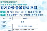 시민행정신문 기자 | 제주특별자치도는 제주지역 요양보호사 인력수급 문제 해결을 위해 오는 11월 14일 오후 2시 호텔샬롬제주 컨벤션홀에서 전문가와 현장 종사자들이 한자리에 모여‘장기요양 돌봄 정책 포럼’을 개최한다고 밝혔다. 이번 포럼은 제주장기요양요원지원센터(센터장 김성건) 주관으로 열리며, 도내 장기요양기관 대표 및 종사자 등 약 120여 명이 참석할 예정이다. 급속한 고령화로 인한 돌봄 인력 부족 문제를 진단하고, 제주지역의 지속 가능한 인력 수급 체계 구축 방안을 모색하기 위해 마련됐다. 포럼은 개회식을 시작으로 주제발표, 종합토론, 질의응답 순으로 진행된다. 첫 번째 주제발표에서는 이희승 박사(국민건강보험공단 건강보험연구원 장기요양정책연구센터 부연구위원)가‘전국 요양보호사 인력 현황과 향후 과제’를 주제로 전국 단위의 인력 현황과 정책적 과제를 짚는다. 이어 김재희 센터장(제주연구원 고령사회연구센터)이‘제주지역 요양보호사 인력 수급 전망 및 정책 과제’를 주제로 발표하며, 제주지역의 현실과 향후 정책 방향을 제시할 예정이다. 이후 진행되는 종합토론에서는 도내 장
