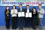 시민행정신문 강갑수 기자 | 전주지역 집배원들이 독거노인 등 취약계층의 안부를 확인하는 든든한 이웃이 돼주기로 했다. 전주시와 전북지방우정청은 1일 시청 3층 소회의실에서 우범기 전주시장과 최승만 청장 직무대리 등 양 기관 관계자들이 참석한 가운데 독거노인 등 취약계층 80세대에 반찬을 배달하고 안부를 확인하는 것을 골자로 한 ‘따뜻한 안부 배달’ 업무협약을 체결했다. 공공기관이 협력해 복지 사각지대를 함께 해소하자는 취지로 이뤄진 이번 협약은 300만 원 상당의 독거노인 반찬 지원(1인당 3~4만 원)을 주요 내용으로 한다. 이날 협약에 따라 올해는 덕진구 권역 저소득 독거노인 80명을 대상으로 반찬 지원이 이뤄질 예정이다. 우정청은 ‘우체국 행복나눔봉사단’의 지원금으로 반찬을 구입하고, 집배원이 직접 소포를 통해 반찬을 배달하며 어르신들의 안부를 확인하는 핵심 역할을 맡는다. 시는 반찬 지원 대상자를 추천하고, 반찬 배달에 필요한 택배비(1인당 1만 원 상당)를 지원하게 된다. 특히 집배원들은 반찬 배달 중 대상자의 건강과 안전에 이상 징후가 감지될 경우 즉시 해당 동에 상황을 공