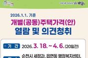 시민행정신문 강갑수 기자 | 순천시는 1월 1일 기준 개별(공동)주택 가격 열람 및 의견제출 기간을 3월 18일부터 4월 6일까지 운영한다고 밝혔다. 이번 열람 대상 개별주택은 32,223호, 공동주택은 90,057호로 개별(공동)주택 특성 등을 조사해 산정했으며, 가격의 공정성과 객관성을 높이기 위해 한국부동산원(순천지사)의 산정가격 적정성 여부 등의 검증 절차를 마쳤다. 개별(공동)주택 가격의 열람은 세정과 및 읍면동 행정복지센터를 방문하거나 순천시 누리집 및 부동산공시가격알리미를 통해 확인할 수 있다. 열람가격에 의견이 있는 소유자 및 이해관계자는 의견서를 작성해 세정과 및 읍면동 행정복지센터를 직접 방문 또는 우편 제출하거나 부동산공시가격알리미를 이용해 온라인 제출하면 된다. 제출된 의견은 개별(공동)주택의 특성, 적정가격, 인근 주택과의 가격 균형 등을 종합적으로 검토한 뒤 순천시 부동산가격 공시위원회의 심의를 거쳐 개별 통지하고, 최종 확정된 개별(공동)주택 가격은 4월 30일에 공시할 예정이다. 시 관계자는 “공시된 주택 가격은 지방세와 국세, 건강보험료 등의 기초자료로