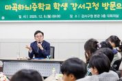 시민행정신문 강갑수 기자 | 진교훈 서울 강서구청장이 8일 구청 대회의실에서 마곡하늬중학교 3학년 학생들과 직접 대화하며 소통하는 시간을 가졌다. 구는 행정이 어떻게 이뤄지고, 공무원이 어떤 역할을 하는지 학생들이 현장에서 직접 체험하며 이해할 수 있도록 이날 자리를 마련했다. 3학년 1반과 4반 학생 40여 명이 구청을 찾아 진 구청장과 만났다. 진 구청장은 “구청에 직접 와보니깐 어때요?”라고 질문을 하며 대화를 이끌어갔다. 학생들의 장난스러운 질문에도 유쾌하게 답변했고 대화 내내 웃음이 끊이지 않았다. 길거리 흡연 등 생활불편부터 강서구의 주요 정책과 예산 규모, 10년 후 강서구에 필요한 정책에 이르기까지 폭넓게 대화했다. 진 구청장은 “마곡지구 발전과 맞물려 유동인구가 많아짐에 따라 간접흡연 피해 민원도 늘고 있다”며 “흡연 단속과 계도를 병행해 피해를 줄여나가겠다”고 말했다. 마곡 통합신청사와 신경제축 조성 등 굵직한 사업에 대해서는 학생들의 눈높이에 맞춰 알기 쉽게 설명했다. 10년 후 정책에 대해선 “변화의 속도가 매우 빠르기 때문에 기술의 발달