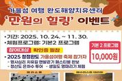 시민행정신문 강갑수 기자 | 완도해양치유센터에서 10월 24일부터 26일까지 개최되는 ‘2025 청정 완도 가을 섬 여행’과 연계하여 ‘만원의 힐링’ 이벤트를 진행한다. ‘만원의 힐링’ 이벤트는 ‘완도왔섬, 치유됐섬’을 주제로 개최되는 ‘2025 청정 완도 가을 섬 여행’을 하는 관광객이 가을 섬 여행과 함께 부담 없이 해양치유 프로그램을 즐길 수 있도록 마련됐다. 이벤트는 ‘청정 완도 가을 섬 여행’의 프로그램인 ▲제2회 명사십리 치유길 맨발 걷기 페스티벌 ▲청산도 은하수 투어 ▲생일도 멍때리기 중 1개 프로그램에 참가(확인증 지참)하면 완도해양치유센터 프로그램(기본 2)을 1만 원에 체험할 수 있다. 참가자들은 10월 24일부터 11월 30일까지 완도해양치유센터 대표 그램인 딸라소풀과 해수 미스트 테라피, 해조류 거품 테라피, 머드 테라피를 이용할 수 있다. 한편 ‘청정 완도 가을 섬 여행’ 기간 동안 완도 해변공원 일원에서 ‘완도 해양치유’ 홍보관을 운영하여 관광객이 완도 여행을 추억할 수 있도록 ‘해양치유 힐링 한 컷’ 즉석 사진 인화 서비스를 제공할 예정이다. 군 관계자는 “힐