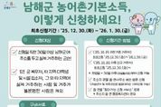 시민행정신문 강갑수 기자 | 남해군은 ‘농어촌 기본소득 시범사업’ 신청 접수를 오는 12월 30일부터 2026년 1월 30일까지 실시한다고 밝혔다. 농어촌 기본소득 시범사업은 남해군에 주민등록을 두고 실제 거주하는 군민을 대상으로 하며, 대상자로 확정될 경우 월 15만 원을 지역사랑상품권(카드형·선불카드)으로 지급하는 사업이다. 신청 대상은 신청일 기준 30일 이상 남해군에 주소를 두고 실제 거주 중인 주민으로, 군 복무자, 타 지역 대학생, 시설 입소자 등 실제 거주가 불분명한 경우는 제외된다. 신청은 주소지 관할 읍·면 행정복지센터 총무팀을 방문해 본인이 직접 신청해야 하며, 신분증을 반드시 지참해야 한다. 미성년자나 피후견인의 경우에는 법정대리인을 통한 대리 신청이 가능하며, 이 경우 대리인 신분증과 가족관계증명서 등 관계를 확인할 수 있는 서류를 제출해야 한다. 거주 시기에 따라 신청 요건도 달라진다. 2025년 10월 19일 이전부터 거주한 기존 주민은 최초 접수 기간 내 신청이 가능하며, 2025년 10월 20일 이후 전입한 신규 거주자는 전입일로부터 30일이 경과한 이후 신청할 수 있다. 신규 전입