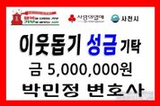 시민행정신문 강갑수 기자 | 박민정 사천시 고문변호사는 지난 15일 사천시청을 방문해 관내 공동생활가정 까치둥지(200만 원), 모모네(150만 원), 호산나 그룹홈(150만 원)에 성금 500만 원을 기탁했다. 박민정 변호사는 법률 전문가로서 아동의 권익 보호에 적극적으로 힘써왔으며, 2022년부터는 관내 어려운 이웃들을 위해 성금과 물품을 꾸준히 기탁하는 등 지역사회에 대한 사랑을 실천하고 있다. 박민정 변호사는 “이번 기탁이 관내 공동생활가정의 아동들에게 도움이 됐으면 좋겠다.”고 말했다. 기탁한 성금은 경남사회복지공동모금회를 통해 공동생활가정에 지정 기탁되어 사용될 예정이다.