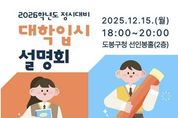 시민행정신문 강갑수 기자 | 서울 도봉구가 12월 15일 오후 6시 도봉구청 2층 선인봉홀에서 2026학년도 대입 정시 전략 설명회를 개최한다. 설명회에는 서울시교육청 대학진학지도지원단 소속의 영동일고 윤희태 교사가 강사로 나서 대입 정시합격을 위한 지원전략을 제공한다. 이번 설명회는 지난 13일 수학능력시험을 치르고 정시 지원을 앞둔 수험생과 학부모들에게 실질적인 도움을 줄 것으로 기대된다. 선착순 300명까지 모집하며, 신청은 11월 27일 오전 9시부터 도봉구청 누리집(소통참여→인터넷 접수·예약)에서 가능하다. 이외에도 수험생의 성공적인 정시 지원을 위해 도봉구 진학상담실에서 정시 컨설팅을 진행한다. 12월 8일부터 23일까지 8일간 운영하며, 시간은 오전 9시부터 오후 8시까지다. 앞서 모집한 도봉구 거주 또는 학교에 재학 중인 고등학생 3학년(N수생 및 학교 밖 청소년 포함) 64명을 대상으로 한다. 오언석 도봉구청장은 "구는 수험생의 성공적인 진학 지원을 위해 올 한해 주요 시기별로 입시 설명회, 입시 교실뿐만 아니라 수시·정시·진학 컨설팅을 진행해왔다."라며,