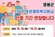 시민행정신문 강갑수 기자 | 영광군은 전 군민에게 50만 원(2차분)을 지급하는 민생경제회복지원금 신청 기간을 10월 31일까지 2주 더 연장한다. 2차 민생경제회복지원금은 지난 9월 1일부터 10월 15일까지 49,230명에게 246억 원이 지급됐고, 1차 민생경제회복지원금 신청 대비 미신청자가 많은 것으로 나타났다. 이와 관련하여 군은 군민들 중 출타로 인한 부재, 민생회복 소비쿠폰과 신청기간(9. 22.∼10. 31.)을 혼동하여 신청하지 못하는 사례가 있음을 반영하여 지원금을 신청하지 못한 군민들이 혜택을 빠짐없이 받을 수 있도록 신청을 연장하게 됐다. 2차 지급대상 50,540명 중 미신청자가 대상이며, 지급 기준일인 2024년 12월 27일부터 신청일까지 계속해서 영광군에 주소를 둔 군민으로, 지급기준일 다음날(2024. 12. 28.)부터 전출, 사망, 말소, 거주불명 등의 사유가 발생한 경우에는 지급대상에서 제외된다. 지원금은 영광사랑카드로 지급되며 2026년 6월 30일까지 연 매출액 30억 원 이하 관내 모든 가맹점에서 사용 가능하며, 기한 내에 미사용 금액은 자동 소멸된다. 신청
