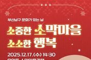 시민행정신문 기자 | 부산 남구는 오는 12월 17일 오후 2시 30분, 우암동 소막마을 주택에서 2025 남구 문화가 있는 날 '소중한 소막마을, 소소한 행복' 공연을 개최한다고 밝혔다. 이번 공연은 역사적 의미가 담긴 소막마을 주택을 지역 문화공간으로 활용하여, 주민들이 일상에서 자연스럽게 문화예술을 접할 수 있도록 마련됐다. 무대는 마술 풍선쇼, 합창, 퓨전국악, 트로트 등 다양한 장르로 구성되어 남녀노소 누구나 부담 없이 즐길 수 있는 무대로 꾸며진다. 특히 소막마을 주택의 아늑한 분위기가 더해져 ‘작지만 소중한 행복’을 나누는 따뜻한 연말 공연이 될 것으로 기대된다. 오은택 남구청장은 “일상 가까이에서 이웃과 함께 문화를 즐기는 경험은 지역 공동체의 정서 교류에 큰 의미가 있다”며 “많은 분이 오셔서 따뜻한 무대와 즐거운 공연을 함께하시길 바란다”고 전했다.