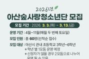 시민행정신문 강갑수 기자 | 아산시는 미래의 숲을 이끌어 갈 차세대 리더로서 성장할 ‘2026년 아산숲사랑청소년단’의 신규 단원을 모집한다. 아산숲사랑청소년단은 숲 체험, 생태 탐방, 환경보호 실천 프로그램 등 다양한 체험 중심 활동으로 자연 친화적 감수성과 공동체 의식을 함양하기 위한 프로그램에 참여하게 된다. 참가자들은 4월부터 11월까지 매월 둘째 주 토요일 정기 활동에 참여하며, 야외 체험학습을 통해 숲과 환경에 대한 이해를 높이고 지속 가능한 삶의 가치를 배우게 된다. 신청 대상은 관내 초등학생 3학년부터 6학년까지 총 60명이며, 신청 기간은 3월 3일부터 3월 13일까지다. 신청은 아산시 산림교육문화 누리집을 통해 가능하며, 세부 사항도 해당 누리집에서 확인할 수 있다. 이병주 산림과장은 “청소년들이 자연 속 체험을 통해 건강한 가치관을 형성하고, 환경 보호의 중요성을 배우는 뜻깊은 기회가 될 것”이라며 “청소년들의 많은 관심과 참여를 바란다”고 말했다.