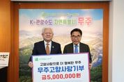 시민행정신문 강갑수 기자 | DH그룹(동해금속(주), 나봄리조트 등) 서동해 회장이 지난 24일 무주군에 고향사랑기부금 5백만 원을 기탁했다. 이날 서동해 회장은 "무주군은 나봄리조트를 통해 소중한 인연을 이어가고 있는 곳”이라며 “무주군과의 상생을 위해 앞으로도 세심한 관심을 쏟을 것”이라고 밝혔다. 전북 완주군에 본사를 둔 DH그룹은 주력 사업인 상용차 및 승용차 부품 생산 분야에서 ‘작지만 강한 기업’으로서의 입지를 확고히 하고 있으며 무주군 설천면에서는 나봄리조트를 운영하고 있다. 봉사 경영을 통한 사회 환원에도 적극적인 것으로도 알려진 DH그룹은 2008년에 설립된 '권정순 장학재단'을 통해 저소득층 지원, 청소년 장학사업, 소외된 이웃돕기 등 사회공헌 활동에 연간 3억여 원을 투입하고 있다. 무주군에는 2023년부터 3년간 총 1천1백만 원의 고향사랑기부금을 기탁해 훈훈함을 전하고 있다.