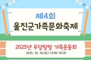 시민행정신문 강갑수 기자 | 울진군은 울진군가족센터가 오는 10월 18일 오후 1시부터 평해생활체육공원 축구장에서 제4회 울진군가족문화축제‘우당탕탕 가족운동회’를 개최한다. 이번 축제는 지난해에 이어 두 번째로 열리는 가족운동회로, 온 가족이 함께 어울려 즐길 수 있는 체험과 놀이 프로그램이 준비된다. 연 만들기, 달고나 만들기, 키링 만들기 등 체험 부스를 마련해 다양한 즐길 거리를 제공하며, 가족 대항 레크리에이션, 행운권 추첨 등 푸짐한 선물이 준비되어 있어 참여 가족 모두가 특별한 추억을 만들 수 있도록 다채롭게 구성할 예정이다. 행사는 오후 1시부터 오후 4시 30분까지 운영되며 울진군민 2인 이상 가족이면 누구나 무료로 참여 가능하다. 참가 신청은 울진군가족센터 홈페이지를 통해 가능하며, 자세한 사항은 유선으로 문의하면 된다. 손병복 울진군수는“이번 축제가 세대가 함께 어울리고 소통하는 장이 되어 가족의 소중함을 다시금 느끼는 계기가 되길 바라며 군민여러분의 많은 참여를 부탁드린다”라고 말했다.
