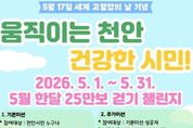 시민행정신문 기자 | 천안시 서북구보건소는 5월 한 달간 ‘움직이는 천안, 건강한 시민!’ 걷기 챌린지를 운영한다고 20일 밝혔다. 이번 챌린지는 걷기를 통해 시민들의 건강한 생활습관 형성을 돕기 위해 마련됐다. 하루 약 8,000보 걷기를 기준으로 한 달간 총 25만 보 달성을 목표로 진행되며, 목표 걸음 수를 달성한 참여자 중 추첨을 통해 300명을 선정해 5,000원~ 1만 원 상당의 모바일 상품권을 제공할 예정이다. 챌린지는 천안시민 누구나 참여할 수 있으며, ‘걷쥬 시즌2’ 앱을 통해 신청하면 된다. 이와 함께 5월 17일 세계 고혈압의 날을 기념해 ‘혈압수치 알기 캠페인’도 운영한다. 목표 걸음 수를 달성한 참여자 중 혈압 측정 사진을 촬영해 커뮤니티 게시판에 올리면 추첨을 통해 10명에게 추가로 상품을 제공할 계획이다. 이현기 서북구보건소장은 “걷기는 누구나 일상에서 쉽게 실천할 수 있는 대표적인 신체활동”이라며 “이번 챌린지를 통해 규칙적인 걷기습관을 형성하고, 심뇌혈관질환 예방의 중요성에 대한 인식이 높아지길 바란다”고 말했다.