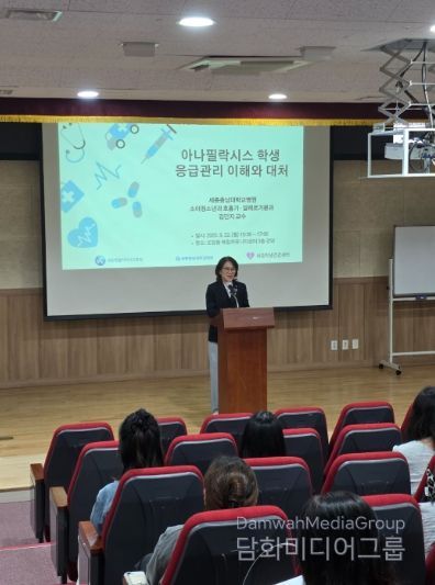 이날 연수에서는 세종충남대학교병원 소아청소년과(호흡기‧알레르기) 김민지 교수가 강사로 나서 급성 과민‧거부 반응(알레르기)과 아나필락시스 이해 및 대처를 주제로 특강을 진행했다.