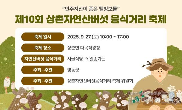 군 관계자는 “상촌자연산버섯 음식거리 축제는 청정 자연에서 자란 버섯 특유의 쫄깃한 식감과 뛰어난 향을 직접 맛보고 즐길 수 있는 특별한 기회”라며 “풍성한 먹거리와 볼거리가 조화된 가을 축제에 많은 분들이 찾아주길 바란다”고 전했다.