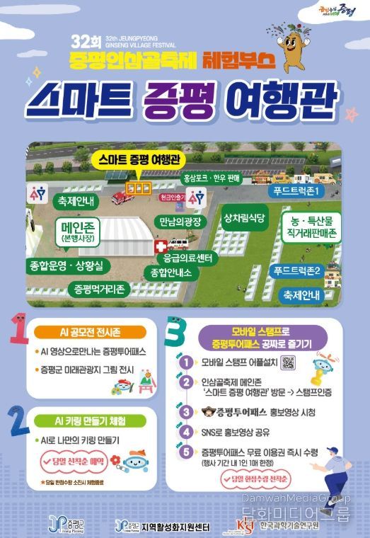 시민행정신문 강갑수 기자 | 충북 증평군이 오는 25일부터 28일까지 열리는 제32회 증평인삼골축제 현장에서 ‘스마트 증평 여행관’을 운영하며 증평 관광의 미래 비전을 선보인다.