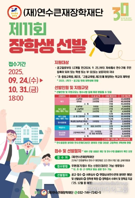 시민행정신문 강갑수 기자 | (재)연수큰재장학재단은 미래 지역사회를 이끌어 갈 우수 인재 발굴과 양성을 위해 제11회 장학생을 선발한다.