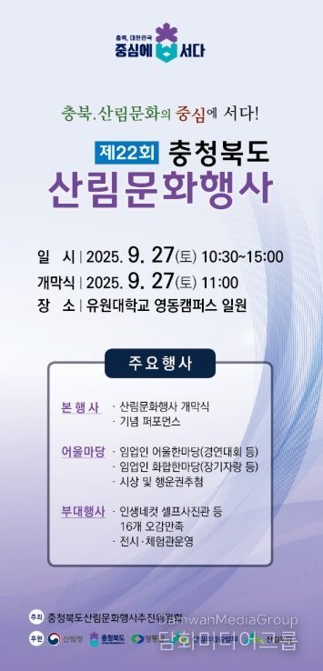 시민행정신문 강갑수 기자 | 제22회 충청북도 산림문화행사가 오는 27일 오전 10시 30분부터 영동군 유원대학교 영동캠퍼스 일원(영동읍 대학로 310)에서 열린다.