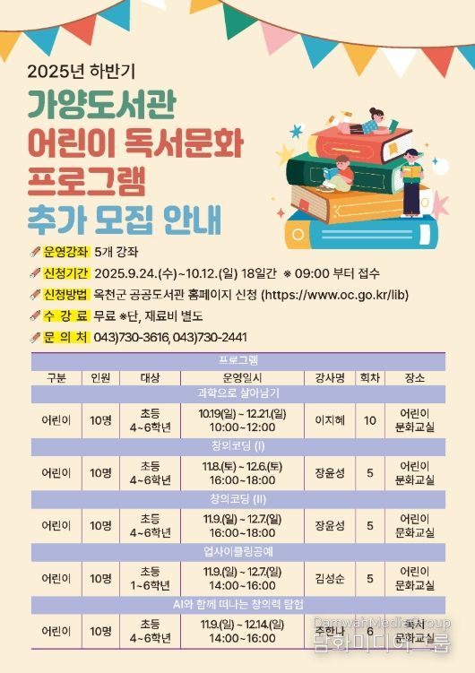 시민행정신문 강갑수 기자 | 옥천 가양도서관은 군민의 독서문화활동을 지원하기 위해 하반기 어린이 독서문화프로그램 수강생을 추가 모집한다.