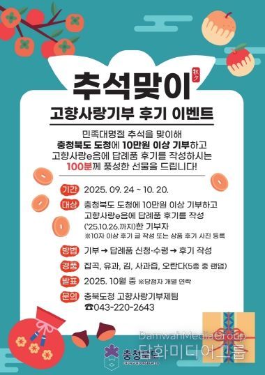 시민행정신문 강갑수 기자 | 충북도는 다가오는 추석을 맞아 지역사랑과 나눔 문화를 확산하기 위해 ‘고향사랑기부제’ 특별 이벤트를 9월 24일부터 10월 20일까지 진행한다.