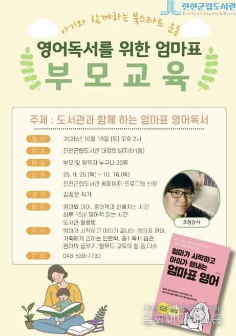 특강은 오는 10월 18일 오후 2시 진천군립도서관 대강의실에서 진행될 예정이며, 부모와 영어책 읽기에 관심이 있는 진천군민 누구나 신청할 수 있다.