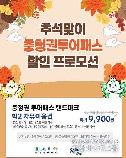 이번 프로모션에서는 충청권투어패스 ‘빅2(2곳 이용권)’ 상품을 정상가 29,900원에서 2만원 할인된 9,900원에 제공한다. 판매 수량은 총 3천 매 한정이며, 9월 26일부터 10월 12일까지 네이버 스마트스토어를 통해 구매할 수 있다. 사용 기한은 10월 31일까지다.