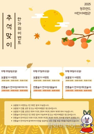 청주랜드 관계자는 “추석을 맞아 어린이들이 가족과 함께 우리 전통문화를 직접 체험하며 즐거운 명절의 추억을 쌓을 수 있도록 다양한 프로그램을 준비했다”며 “많은 시민들의 관심과 참여를 바란다”고 전했다.