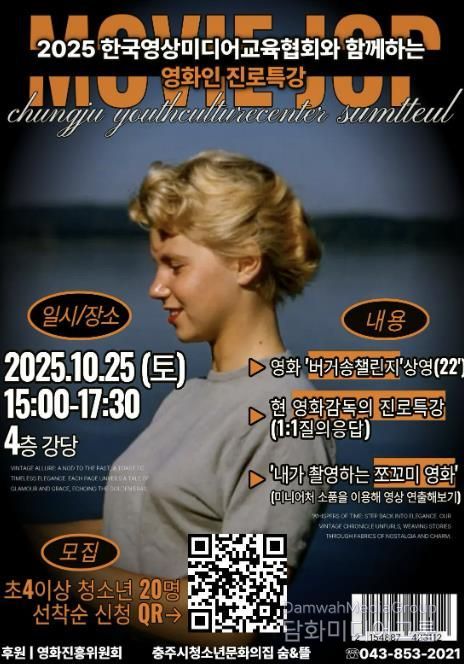 행사는 10월 25일 오후 3시부터 5시 30분까지 충주시청소년문화의집 숨·뜰 4층 강당에서 진행되며 ▲영화 ‘버거송 챌린지’ 상영(22분), ▲현직 영화감독과의 진로 특강 및 1:1 질의응답 ▲‘내가 촬영하는 쪼꼬미 영화(미니어처 소품을 이용한 영상 연출 활동)’ 등의 프로그램이 진행된다.