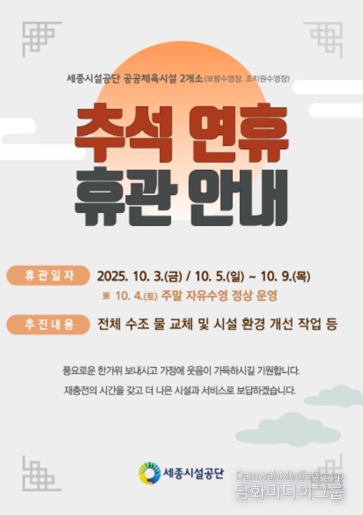 조소연 이사장은 “명절 연휴 기간 시설 개선과 환경정비를 철저히 준비하여 시민 여러분께 더욱 깨끗하고 안전한 수영장을 제공하겠다”며, “즐겁고 건강한 추석 연휴 보내시길 바란다”라고 전했다.