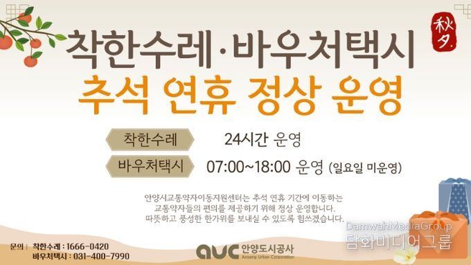 시민행정신문 강갑수 기자 | 안양시가 오는 추석 연휴 기간(10.3.~10.9.)에 교통약자의 이동권 보장을 위한 특별교통수단 이동지원서비스 ‘착한수레’와 ‘바우처택시’를 정상 운행한다고 1일 밝혔다.