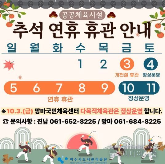 시민행정신문 강갑수 기자 | 여수시도시관리공단은 대명절 추석 연휴 기간(10월 5일~10월 9일) 동안 공단이 운영 중인 공공 체육시설을 휴관한다고 밝혔다.