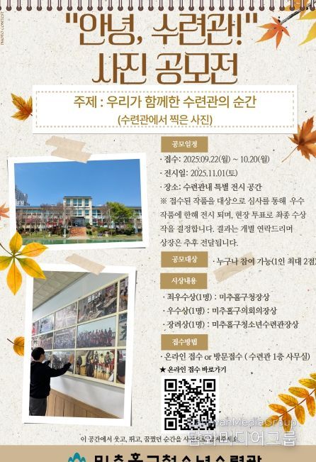 시민행정신문 강갑수 기자 | 인천 미추홀구청소년수련관은 수련관 이전을 앞두고 지난 30여 년간의 추억을 함께 기록하기 위해 ‘안녕, 수련관’ 사진 공모전을 진행하고 있다고 2일 밝혔다.