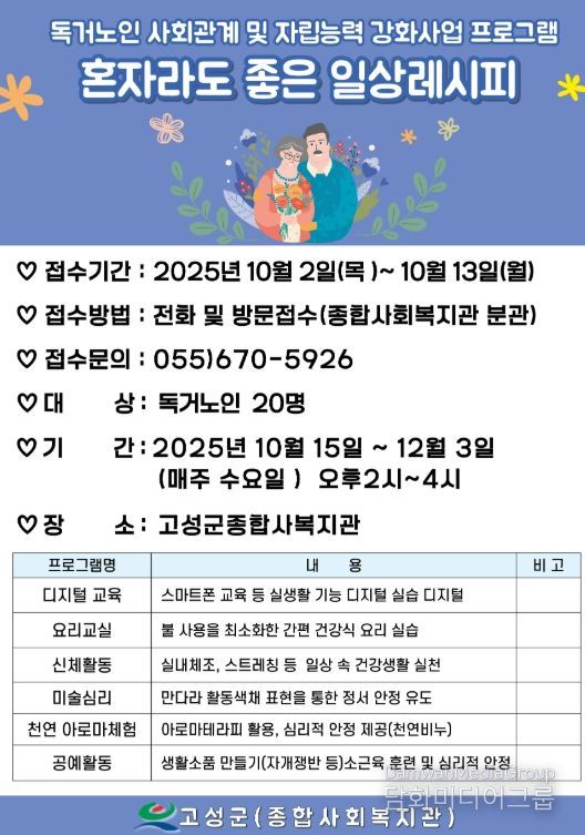시민행정신문 기자 | 고성군은 10월 2일부터 13일까지 고성군종합사회복지관에서 독거노인 어르신을 대상으로 독거노인 자립 및 사회관계 형성 프로그램 ‘혼자라도 좋은 일상레시피’ 참여자를 모집한다.