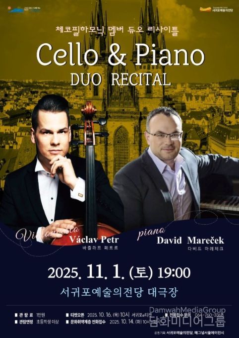 시민행정신문 기자 | 서귀포시는 11월 1일 오후 7시, 서귀포예술의전당 대극장에서 체코필하모닉오케스트라 멤버 '첼로 & 피아노 듀오 리사이틀'을 개최한다고 밝혔다.