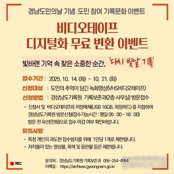 시민행정신문 기자 | 경상남도기록원은 10월 14일부터 31일까지 도민이 소중한 추억을 오래도록 보존할 수 있도록 '빛바랜 기록 속 찾은 소중한 순간 – 다시 빛날 기록'이라는 주제로 비디오테이프 디지털 변환 이벤트를 추진한다고 밝혔다.