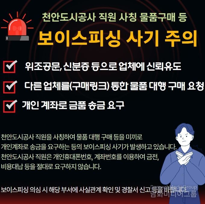 시민행정신문 강갑수 기자 | 천안도시공사가 최근 공사 직원을 사칭한 보이스피싱 사례가 발생함에 따라 피해 예방을 위한 주의를 당부했다.