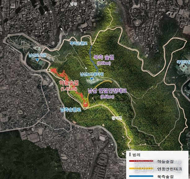 울창한 숲을 관통해 자연을 온전히 체험할 수 있는 ‘하늘숲길’은 확 트인 도심 경관은 물론 멀리 한강과 관악산까지도 조망 가능한 것이 특징이다. 또 기존 가파른 경사와 협소한 보행로를 개선해 보행약자는 물론 남녀노소 누구나 안전하고 편리하게 접근할 수 있도록 했다.