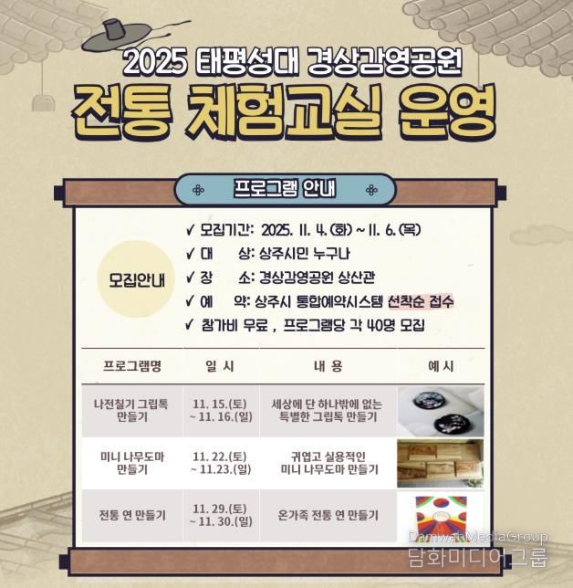 시민행정신문 강갑수 기자 | 상주시는 오는 11월 15일부터 11월 30일까지 전통문화 체험 프로그램인 ‘2025 태평성대 경상감영공원 전통 체험 교실’을 운영한다.