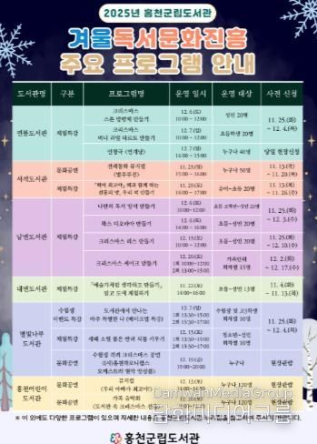 시민행정신문 강갑수 기자 | 홍천군립도서관은 겨울철 독서 의욕 고취와 도서관 이용 활성화를 위해 11월 21일부터 12월 24일까지 연봉도서관, 서석도서관, 남면도서관, 내면도서관, 별빛나루도서관, 홍천어린이도서관 등 6개 도서관에서 ‘겨울과 크리스마스’를 주제로 한 독서문화진흥 프로그램을 운영한다.