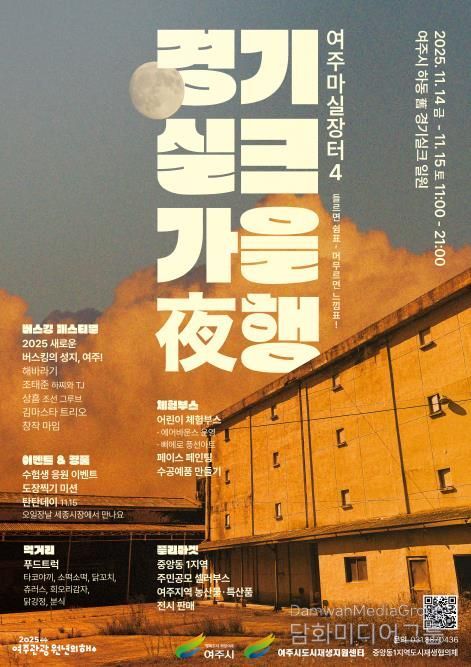 시민행정신문 기자 | 여주시는 오는 11월 14일부터 15일까지 이틀간 여주 경기실크 일원(여주시 하동 123-6번지)에서 '여주마실장터4 가을야행'을 개최한다고 밝혔다. 이번 행사는 '2025 새로운 버스킹의 성지, 여주!'라는 슬로건 아래, 깊어가는 가을밤의 정취를 더할 버스킹 페스티벌과 함께 다채로운 마켓과 체험을 선보일 예정이다.