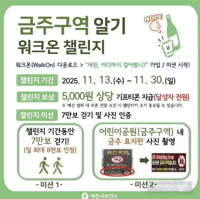 챌린지 미션은 △기간 중 7만보 달성(1일 최대 8,000보 인정) △제천시 내 어린이공원 방문 후 금주구역 표지판 사진 인증으로 구성된다. 미션을 모두 완료한 시민에게는 전원 모바일 상품권(5,000원 상당)이 지급된다.