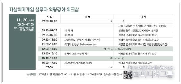 시민행정신문 강갑수 기자 | 원주시자살예방센터는 오는 20일 원주시티호텔 기업도시점 애스턴포레홀에서 ‘자살위기개입 실무자 역량강화 워크숍’을 개최한다.