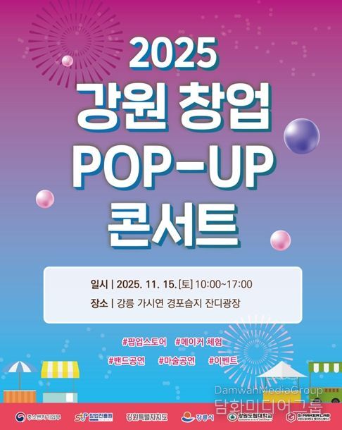시민행정신문 강갑수 기자 | 강원도립대학교는 오는 11월 15일, 강릉 경포 가시연 습지 잔디광장에서 도내 창업자와 지역주민이 함께 참여하는 '2025 강원 창업 팝-업(POP-UP) 콘서트'를 개최한다.