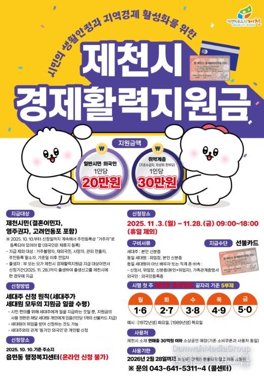 기준일(2025년 10월 10일)부터 신청일까지 제천시에 주소를 두고 있는 시민이라면 1인당 20만 원의 선불카드를 받을 수 있으며, 기초생활수급자, 차상위계층, 한부모가족 등 취약계층은 30만 원의 선불카드를 지급받을 수 있다.
